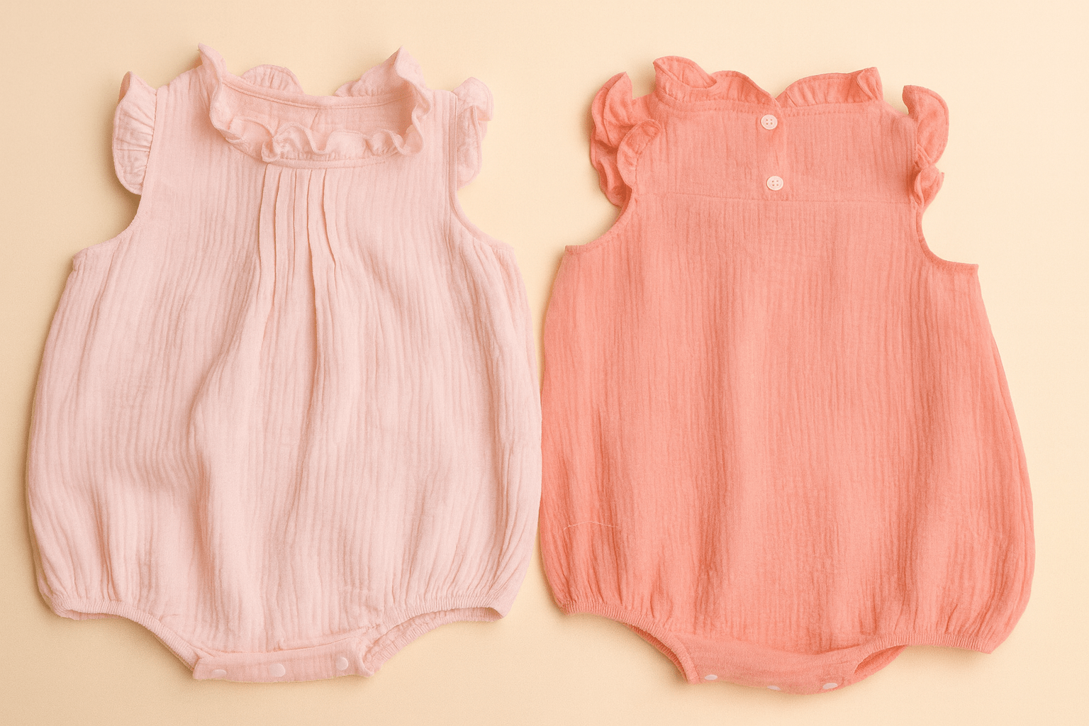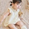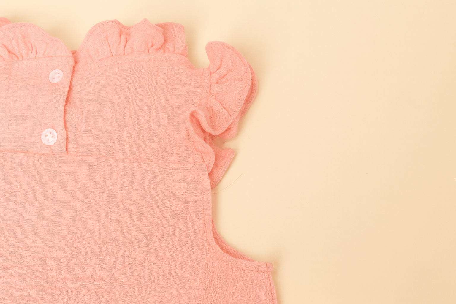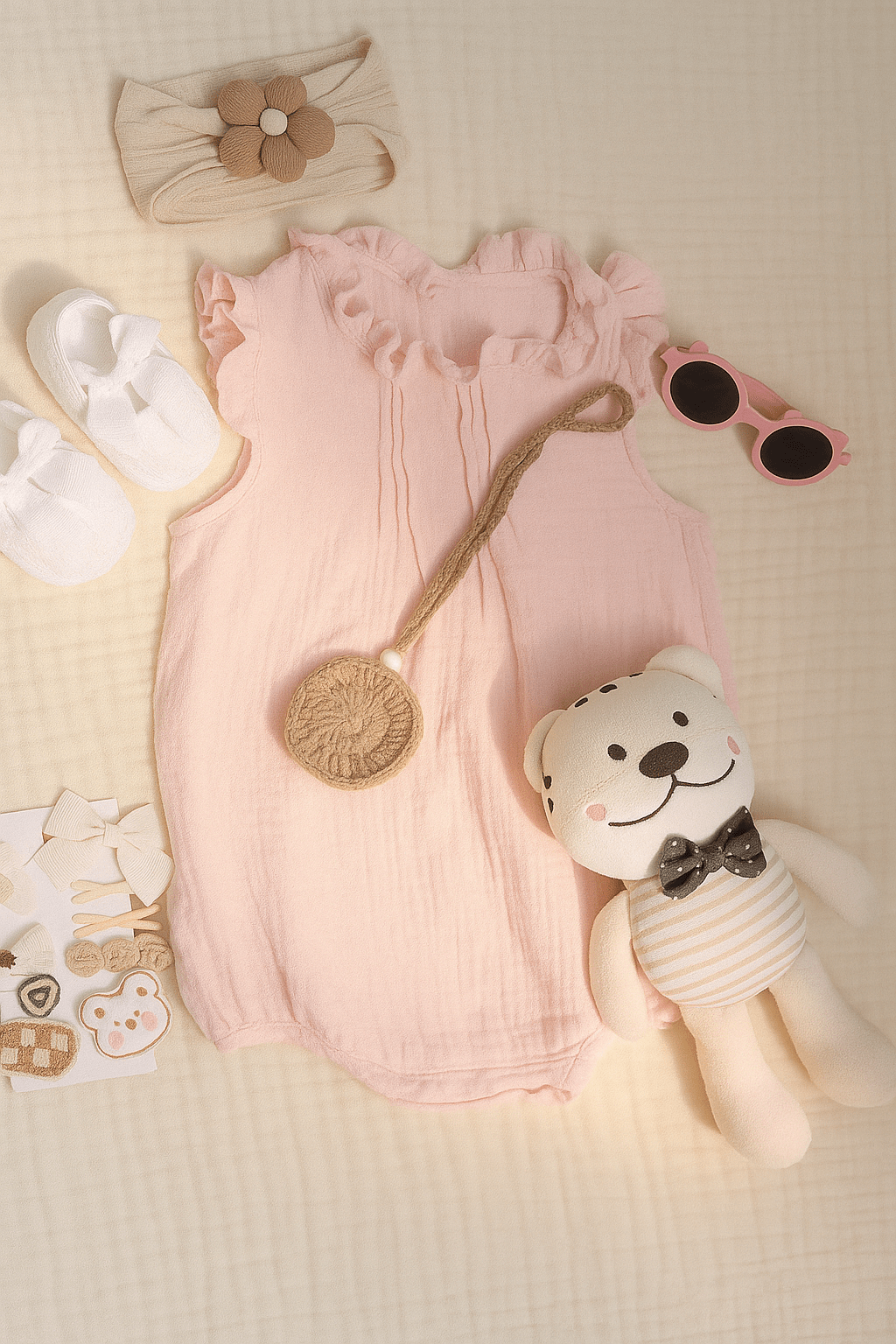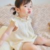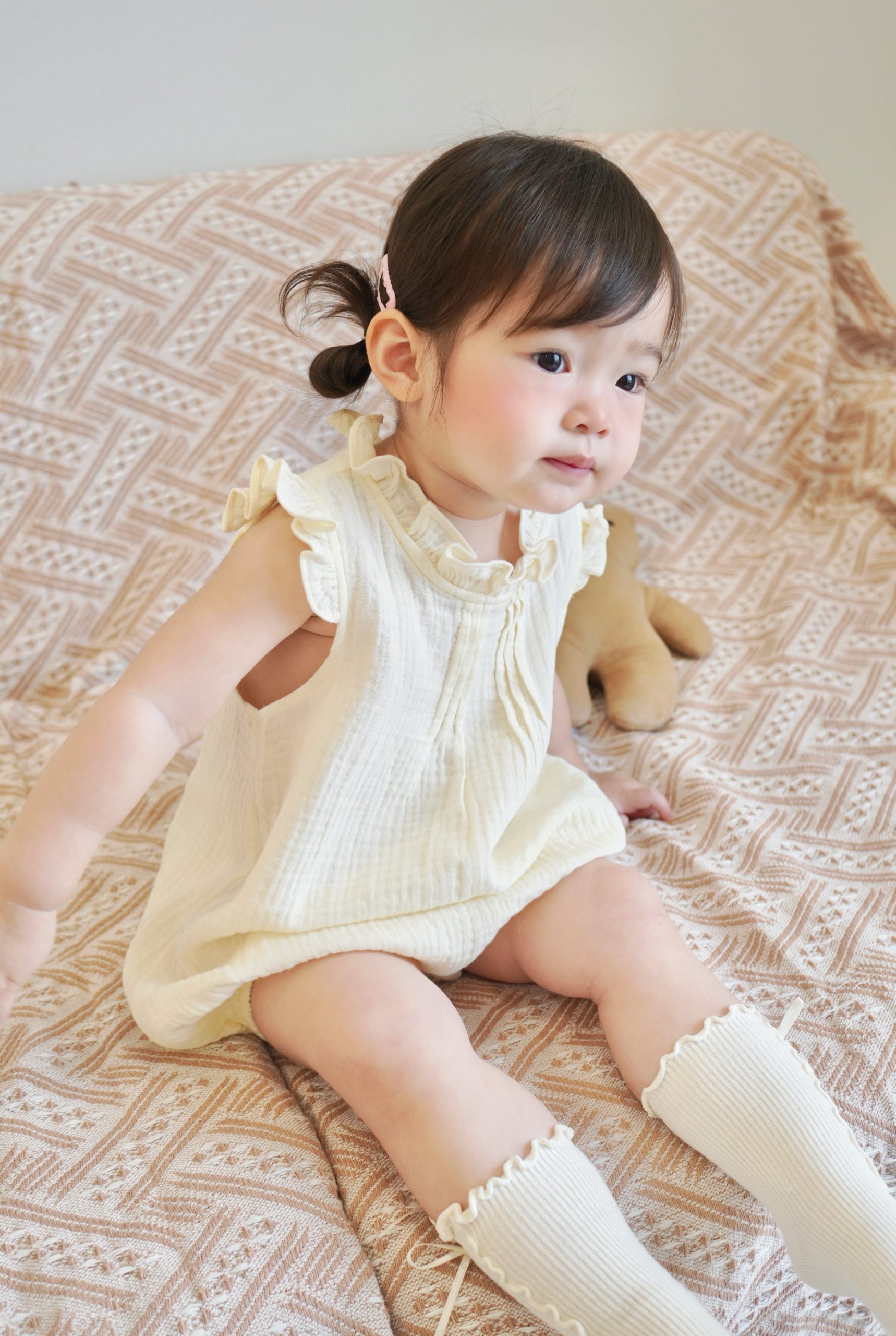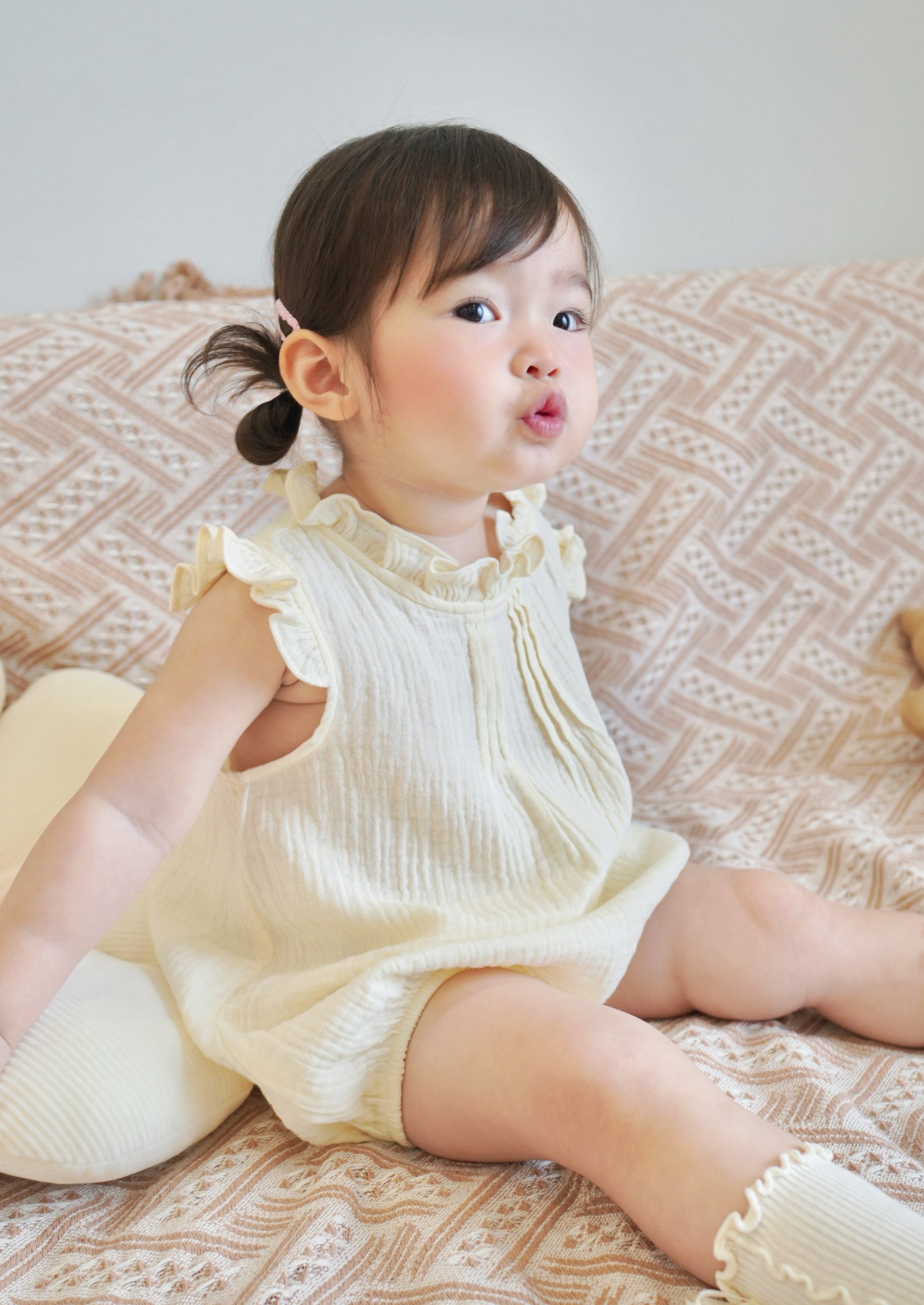 Chiếc romper nhẹ nhàng, được thiết kế với chất liệu muslin mềm mại, thoáng mát – mang đến cảm giác êm ái tuyệt đối cho làn da nhạy cảm của bé. Phần cổ bèo tinh tế kết hợp cùng tay áo cánh tiên tạo nên điểm nhấn duyên dáng, đầy nữ tính.